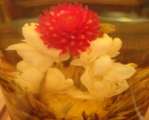 その茶葉の中に、ジャスミンや千日紅、百合や菊、カーネーションといった色とりどりの花を埋め込んでいるものが多く、見た目にも楽しく、水中花のように美しいお茶です。